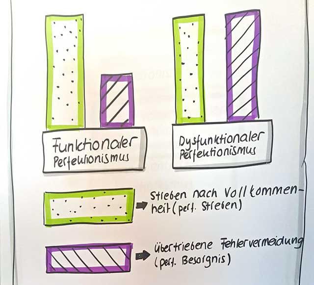 In der Fachliteratur spricht man bei einem solchen Verhalten von perfektionistischen Tendenzen. Perfektionismus wird in funktionalen und dysfunktionalen Perfektionismus unterteilt (hier geht es zum vertiefenden Onlinekurs). Beide verbindet das grosse Streben nach Vollkommenheit. Beim funktionalen Perfektionismus besteht die Bereitschaft, Fehler zu machen. Das treffen wir auf eine positive Art zum Beispiel im Sport oder auch in der Musik an. Beim dysfunktionalen Perfektionismus vermeidet die betroffene Person Fehler komplett.